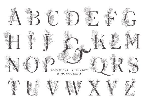 Botanical Floral Alphabet Leaves Flowers Peony Rose Dahlia Etsy